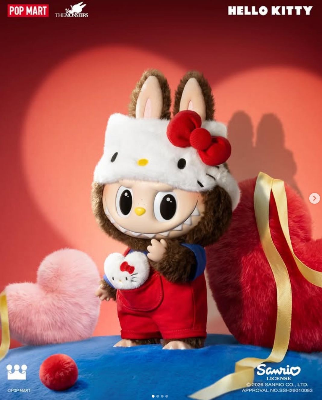 The figure features LABUBU wearing a Hello Kitty-inspired outfit, blending the mischievous Monsters aesthetic with Sanrioβs classic cute style.